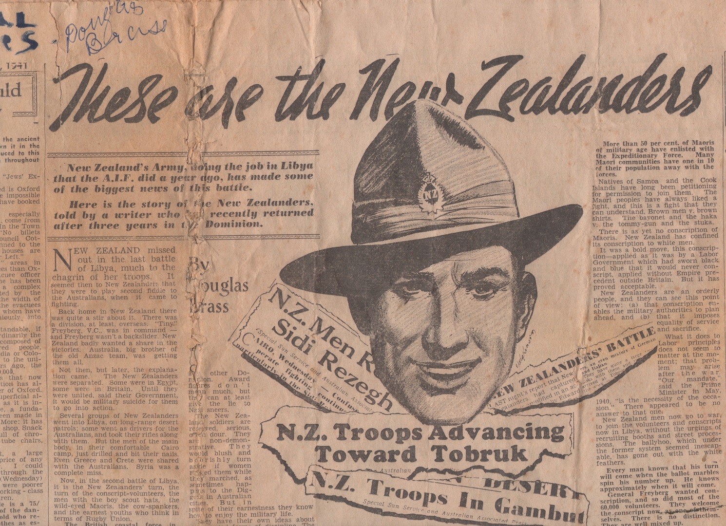 This site also highlights the career of New Zealand-born journalist Douglas Brass. His major 1941 column, ‘These are the New Zealanders’, profiled, for readers of the Melbourne Herald, the Kiwi soldiers fighting in Libya. He then became an acclaimed and internationally published war correspondent and had a distinguished post-war career as a journalist and newspaper executive.
